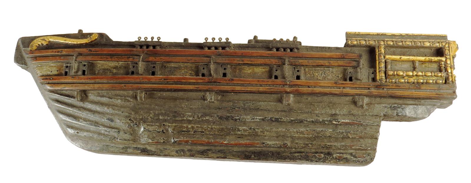 A 19th century carved and painted wood half-block model of a ship, with parcel gilt decoration, 24cm high, 86cm wide.