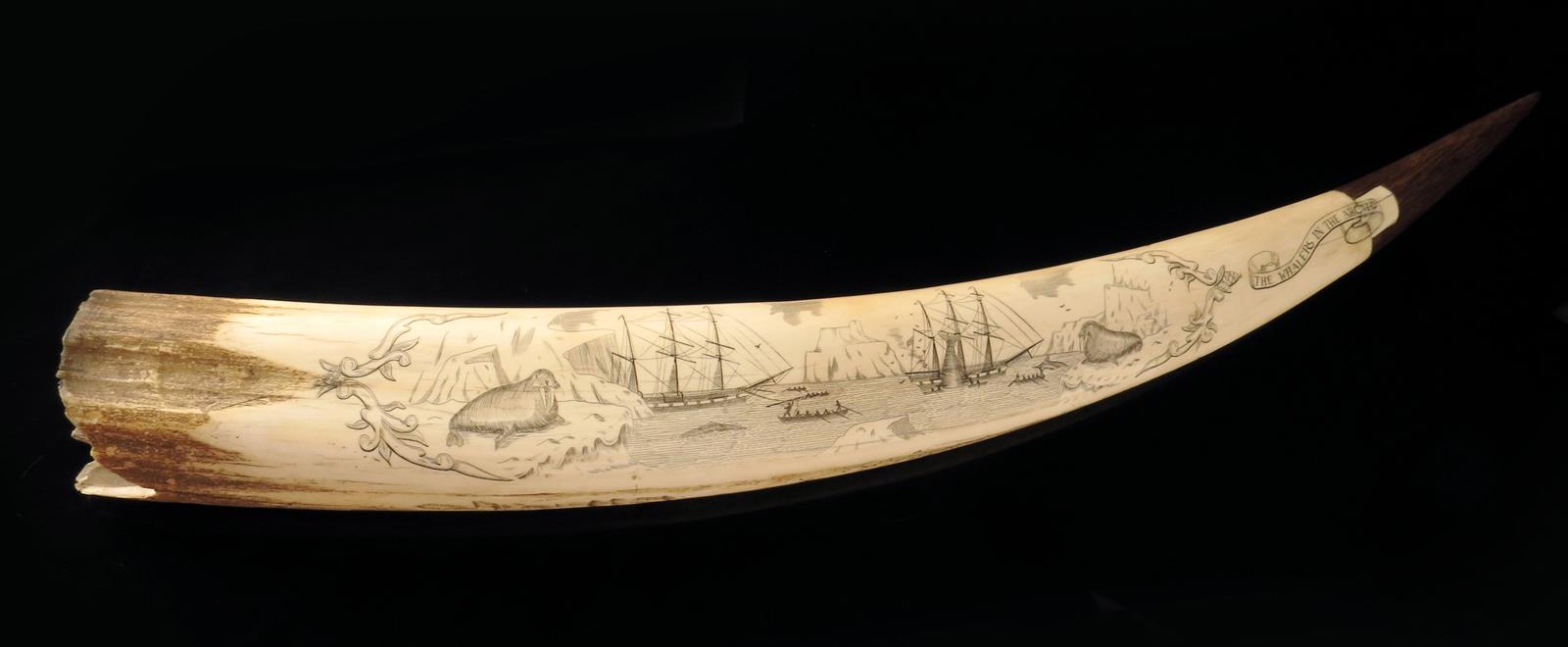 A sailor's scrimshaw walrus tusk, one side engraved with a whaling scene flanked by a pair of walrus, with an inscribed banner 'THE WHALERS IN THE ARCTIC', with a replaced tip in wood, 52.4cm long.