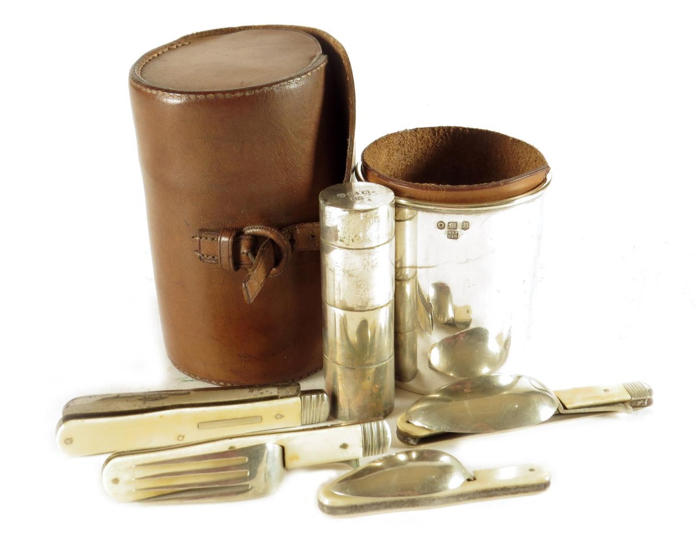 λ Campaign interest. A Victorian cutlery set by Mappin, with a silver plated beaker containing folding ivory handled knife, spoons and fork, together with a condiment tower, in a leather case, stamped 'MAPPIN BROTHERS, CUTLERS TO THE QUEEN, LONDON & SHEFFIELD', 13.1cm, long.