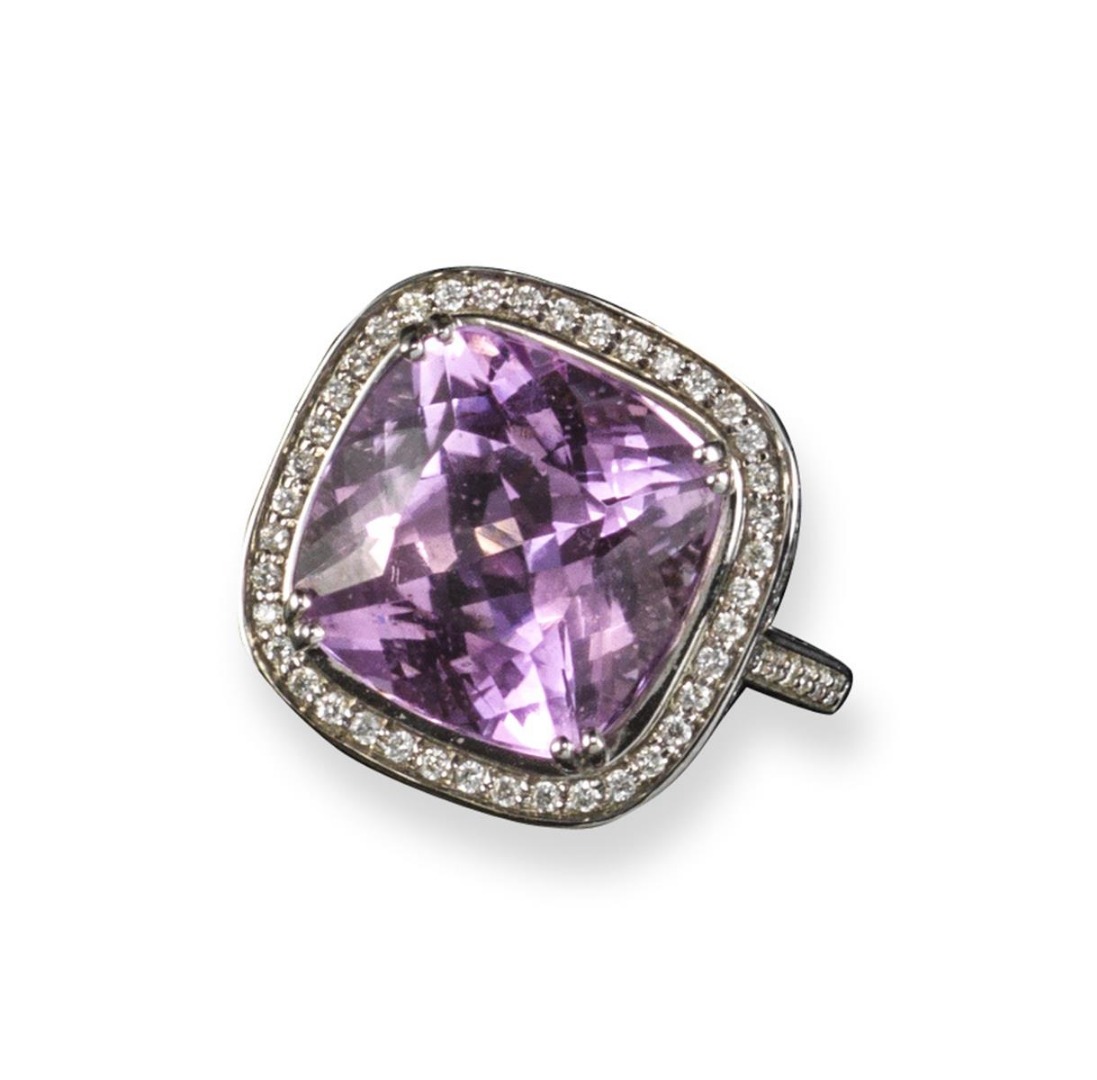 A kunzite and diamond cluster ring, the square kunzite is set within a surround of circular-cut diamonds with a diamond-set shank in white gold. Size P 1/2.
