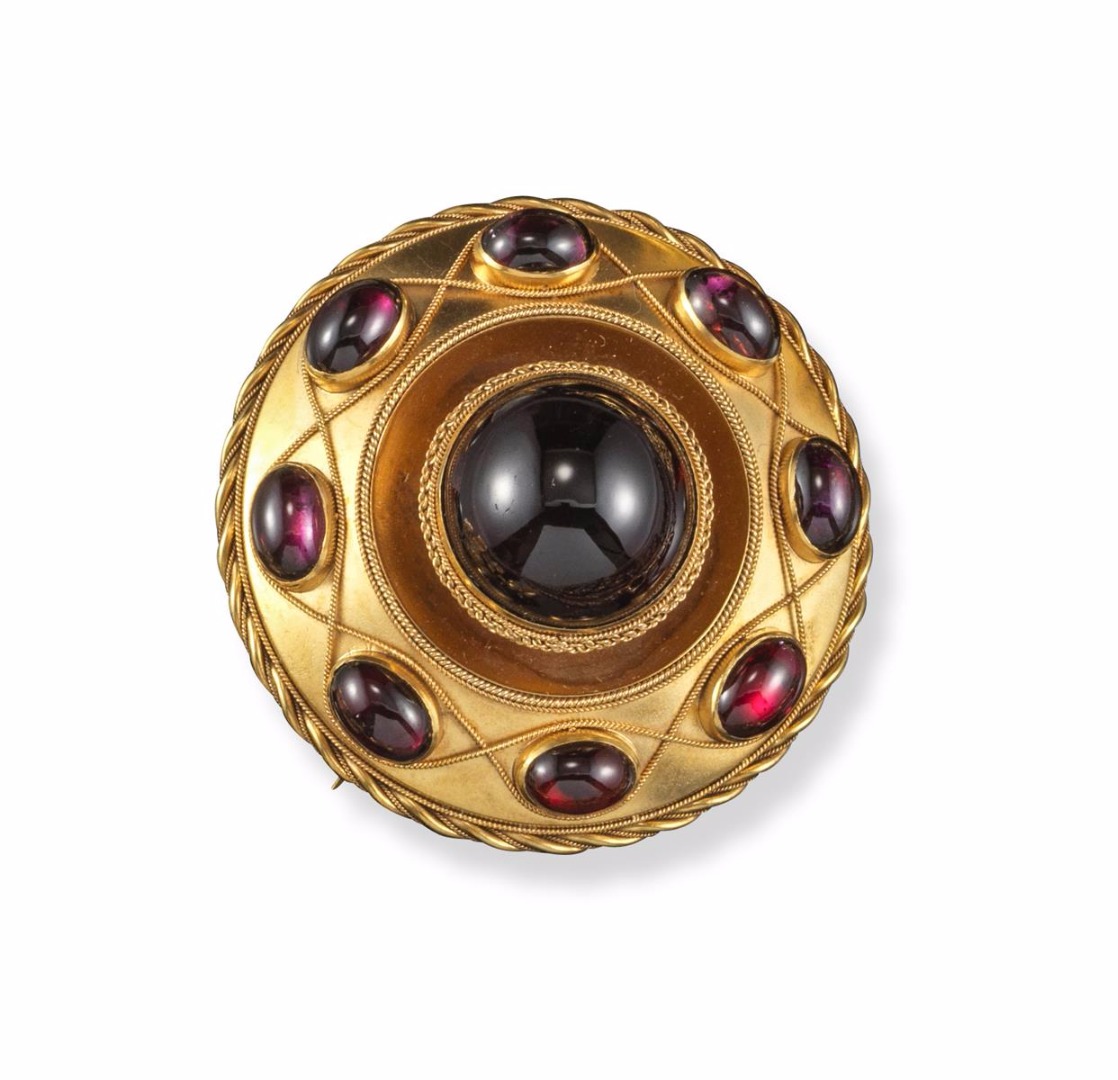 A Victorian gold target brooch, centred with a large garnet cabochon within filigree surround and smaller oval garnet cabochons in yellow gold. 4.6cm diameter.