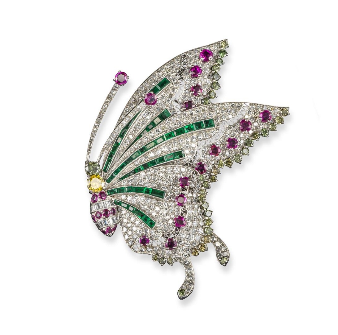 A gem-set gold butterfly brooch, the stylised butterfly is set with one green and one yellow diamond to it's body, the antennae mounted en tremblant and millegrain set with diamonds and ruby terminals. The articulated wings set overall with emeralds, rubies, diamonds and coloured diamonds. 8cm high.