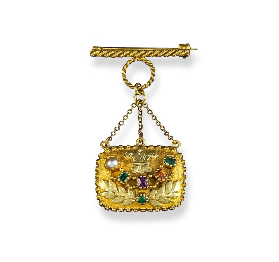A Regency gold brooch, the rectangular locket applied with laurels and stones which spell out the work PEACE beneath Prince of Wales feathers. Suspended from a fine-link gold chain and ropetwist bar brooch. 4cm high.