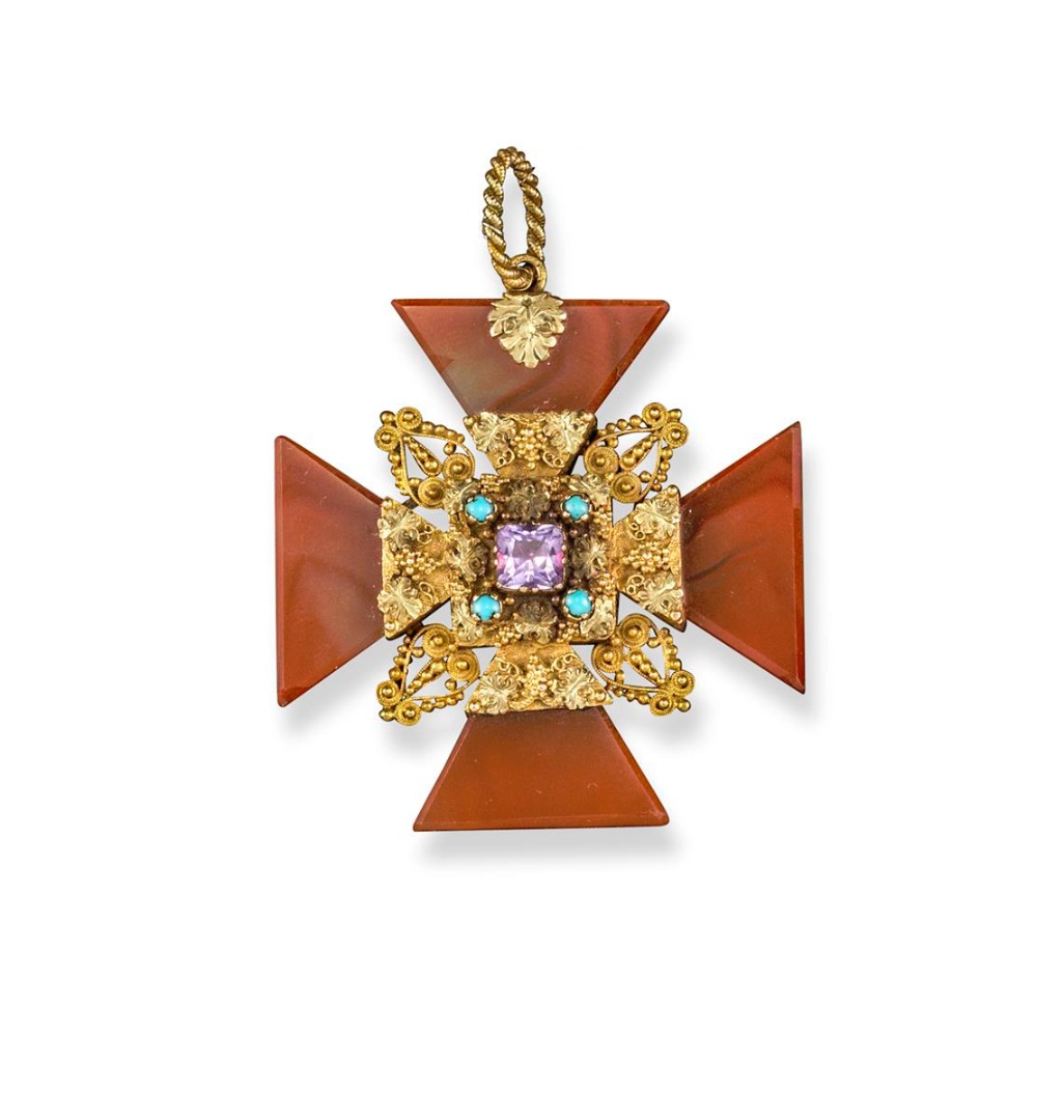 A Regency agate-mounted gold Maltese cross, the square gold cannetille centre mounted with an amethyst and four turquoise cabochons. Suspended from a gold ropetwist bale. 4cm wide.