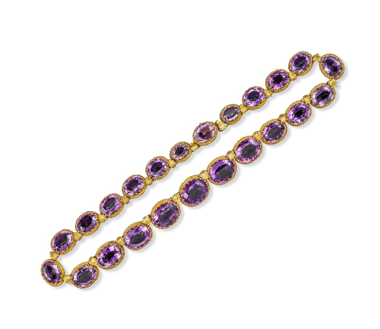 A late Victorian amethyst riviere necklace, the graduated oval-shaped amethysts are set in yellow gold coronet mounts with gold pellet border. Each separated with a stylised yellow gold leaf. 40cm.