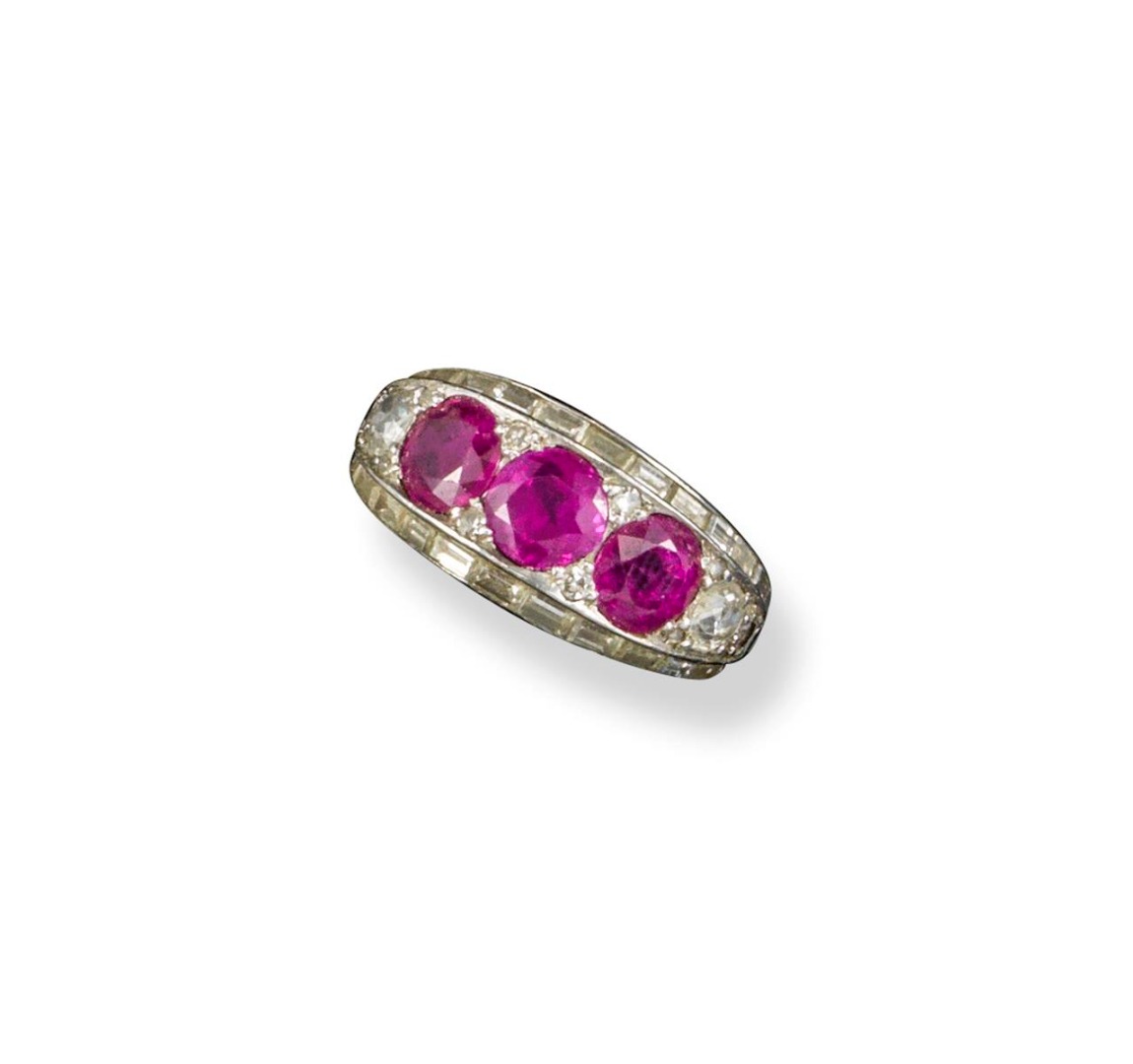 A ruby and diamond bombe-shaped ring, the three circular-cut rubies pave-set within old cut diamonds and a border of baguette-shaped diamonds in platinum. Later shank. Size N.