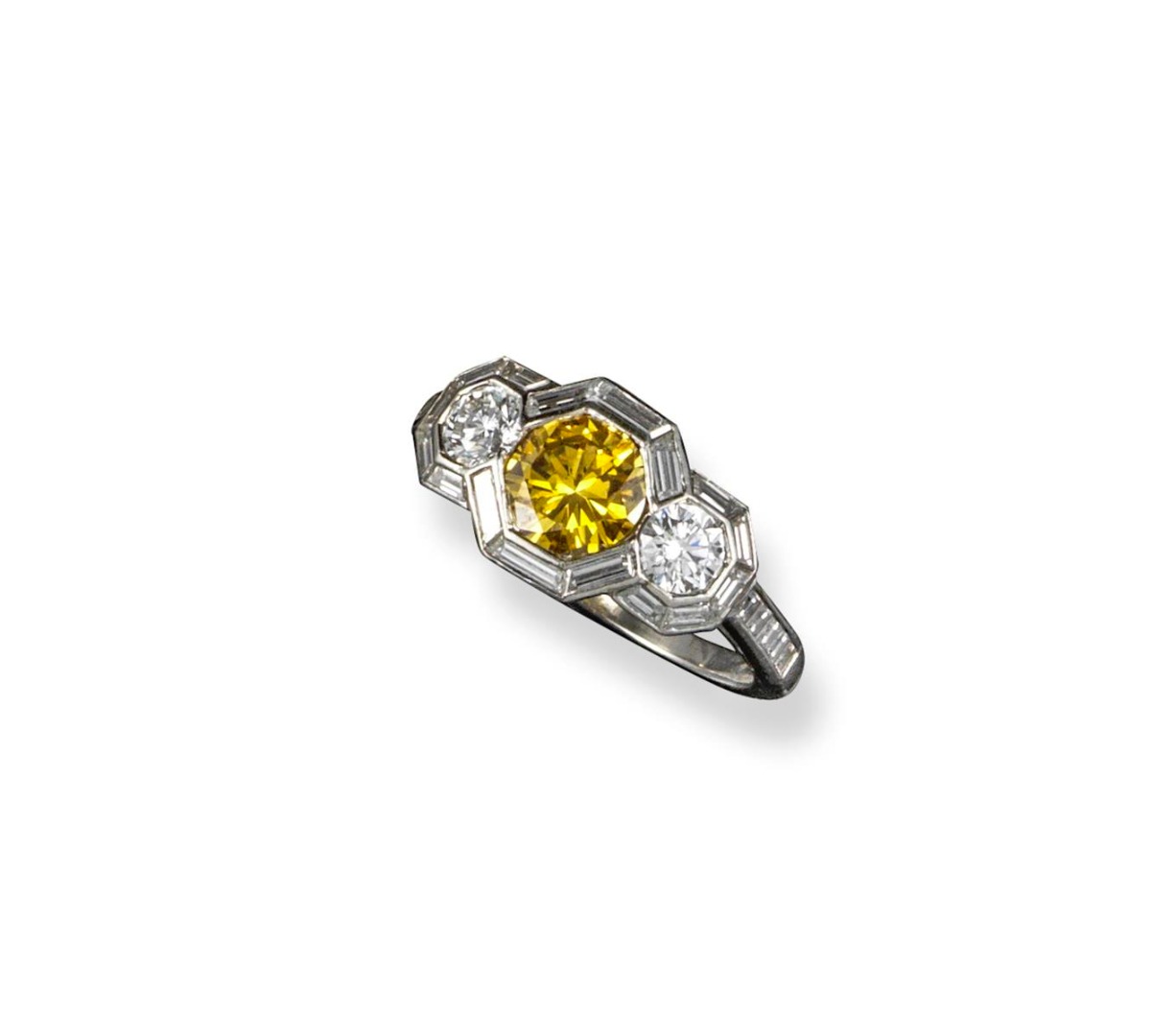 A French yellow and white diamond cluster ring, the circular-cut yellow diamond is set within octagonal border of baguette-shaped diamonds, two circular-cut diamonds and square-shaped shoulder diamonds in platinum. French control marks. Size P 1/2.