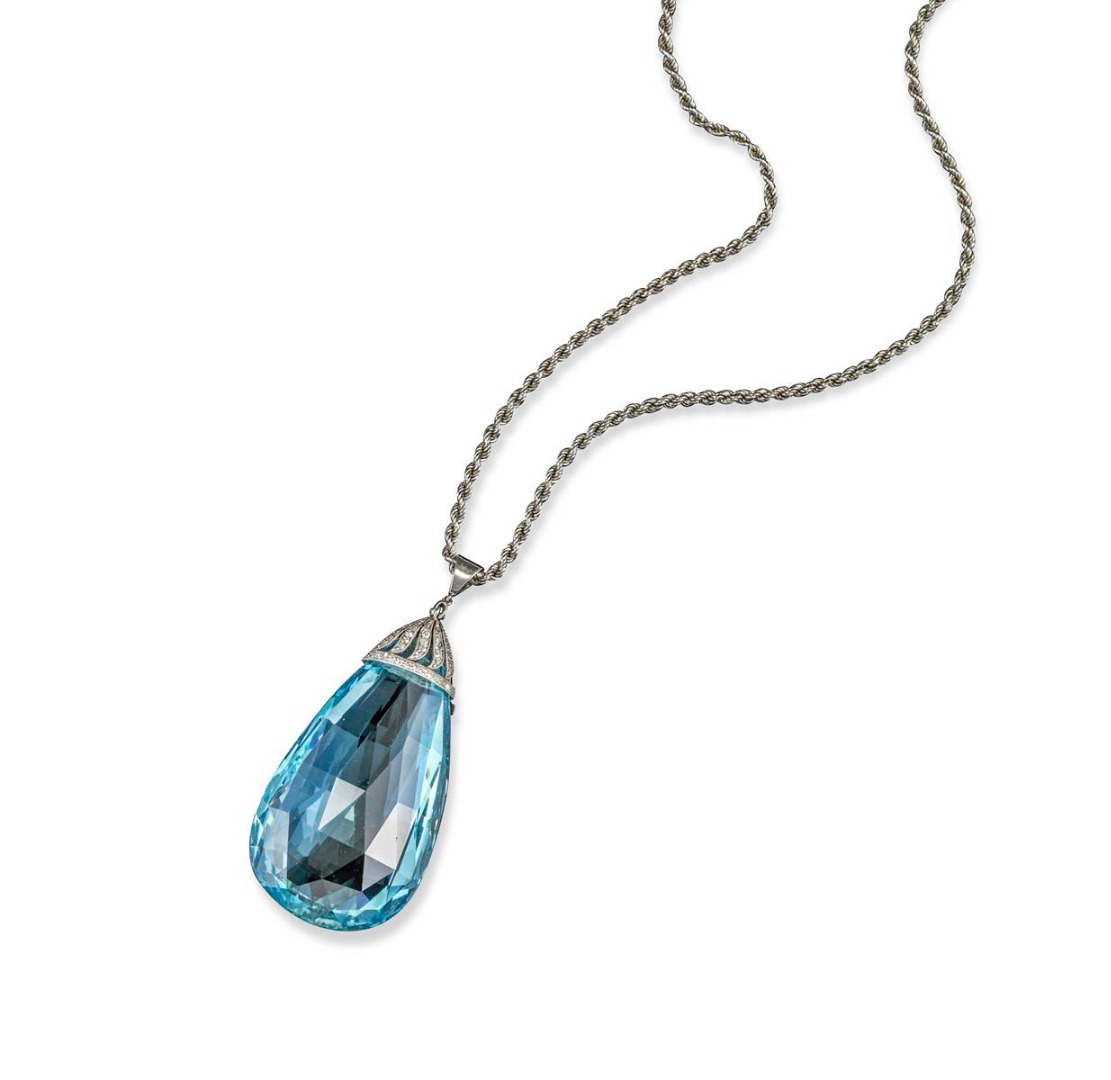 An Edwardian flattened briolette-shaped aquamarine and diamond pendant, the aquamarine weighs approximately 149.23cts. The foliate-design suspension cap is millegrain-set with graduated small circular-cut diamonds in white gold. 5.5cm high. With later white gold bale and white gold ropetwist necklace.