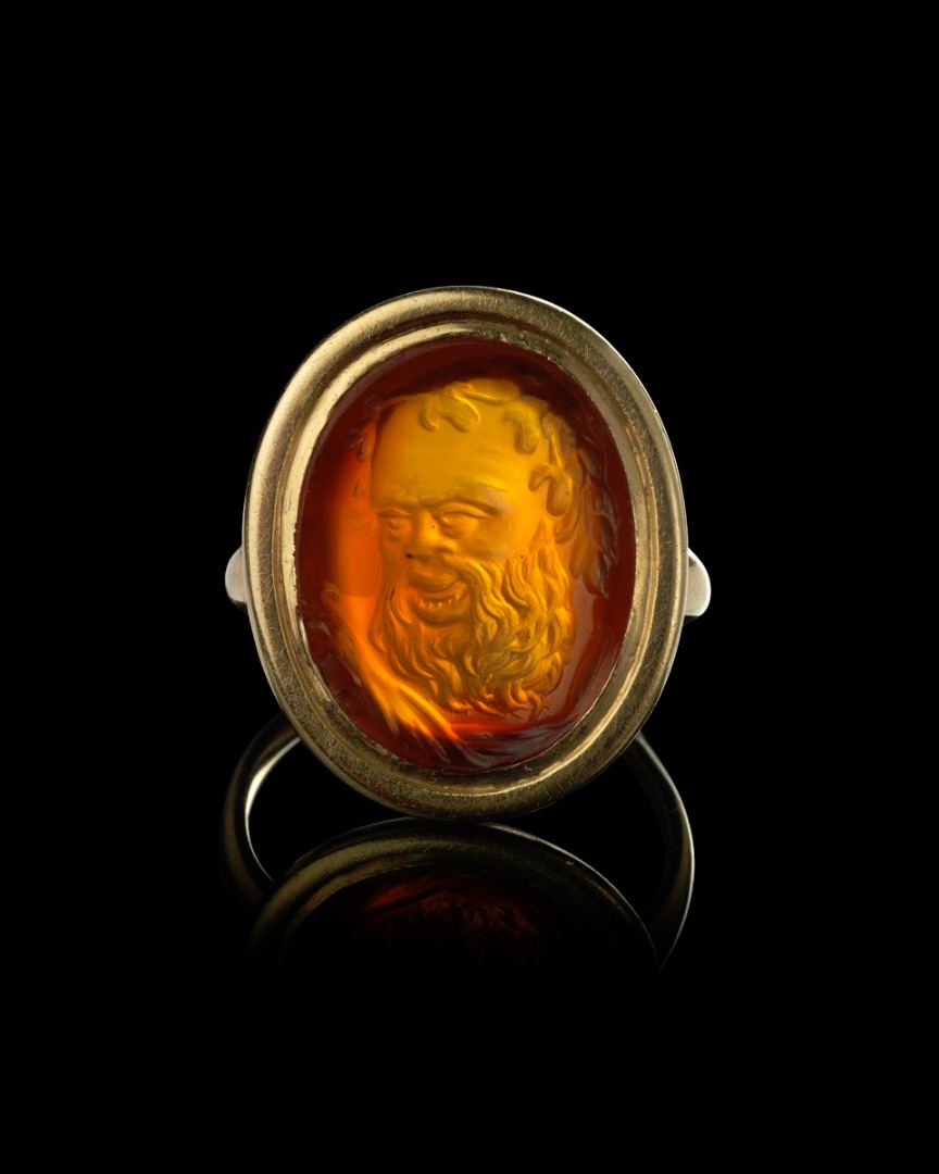 A deeply carved oval carnelian-mounted gold ring, the intaglio second half 18th century and depicting the head of Bacchus. Contemporary mount. Intaglio 1.8cm high, size G. Case.