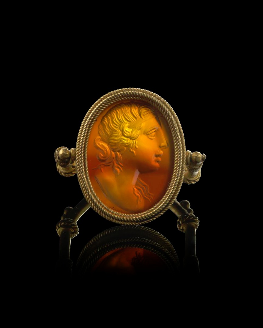 A carved oval-shaped agate intaglio mounted gold swivel ring, in the Etruscan Revival manner. The 19th century intaglio depicting the profile of a young man of rank or possibly Apollo, the mount with fine rope and pellet decoration. The intaglio 1.5cm high, the stirrup-form shank size F 1/2. Case.