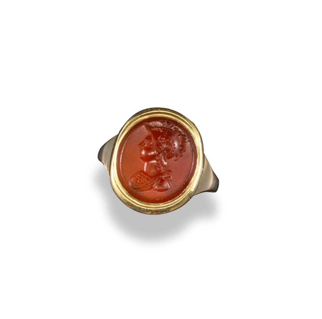 A carved carnelian oval-shaped intaglio mounted gold ring, the early 19th century intaglio depicting Roma. 18th century closed-back mount. Size N. Case.