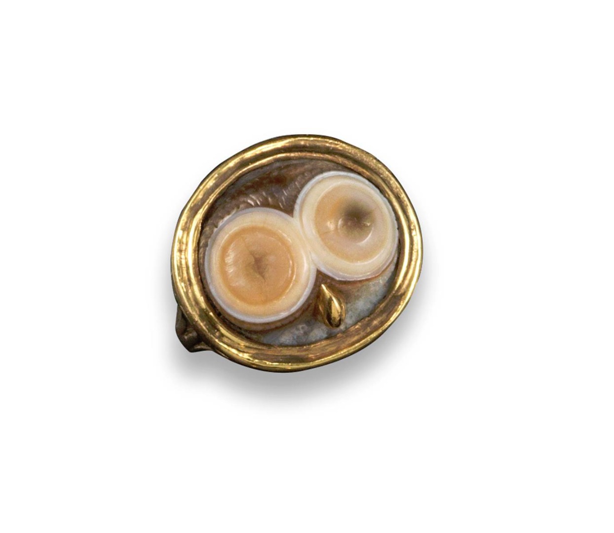 A carved oval double eye agate cameo-mounted gold ring, the Renaissance cameo, 16th century, depicting the head of an owl and applied with a gold beak. The cameo 1.6cm wide. The late 18th century mount with fluted shoulders. Size I. Case.