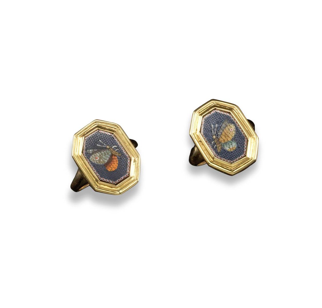 A pair of early 19th century romantic micromosaic rings, the octagonal copper-based mosaics depicting butterflies, emblematic of the soul. Both micromosaics 1.4cm high. Gold mounts. Sizes K for a woman and N1/2 for a man. Case by Wartski.