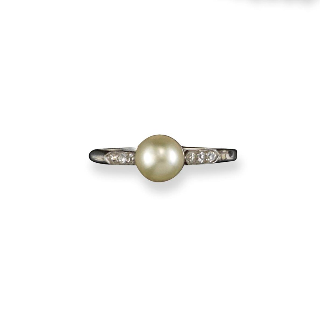 A natural pearl and diamond ring, the button-shaped pearl ring is set with three circular-cut diamonds to each shoulder in platinum and white gold. Size V.