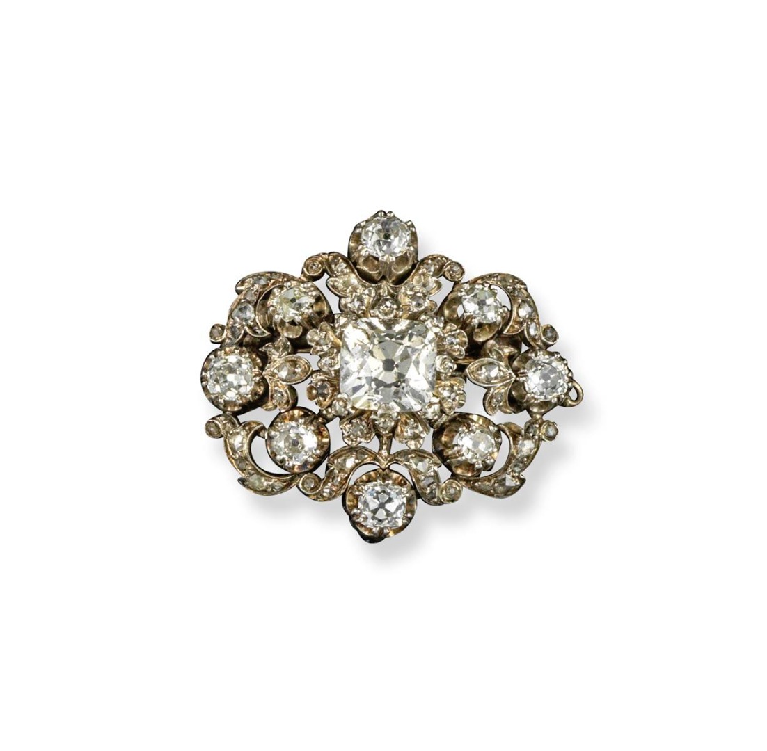 A 19th century diamond-set openwork scroll brooch, the centre old square cushion-shaped diamond weighs 3.49cts and is set in silver and gold with smaller cushion-shaped and rose cut diamonds. With detachable pendant loop set with three small graduated diamonds. The brooch 3.5cm wide.
