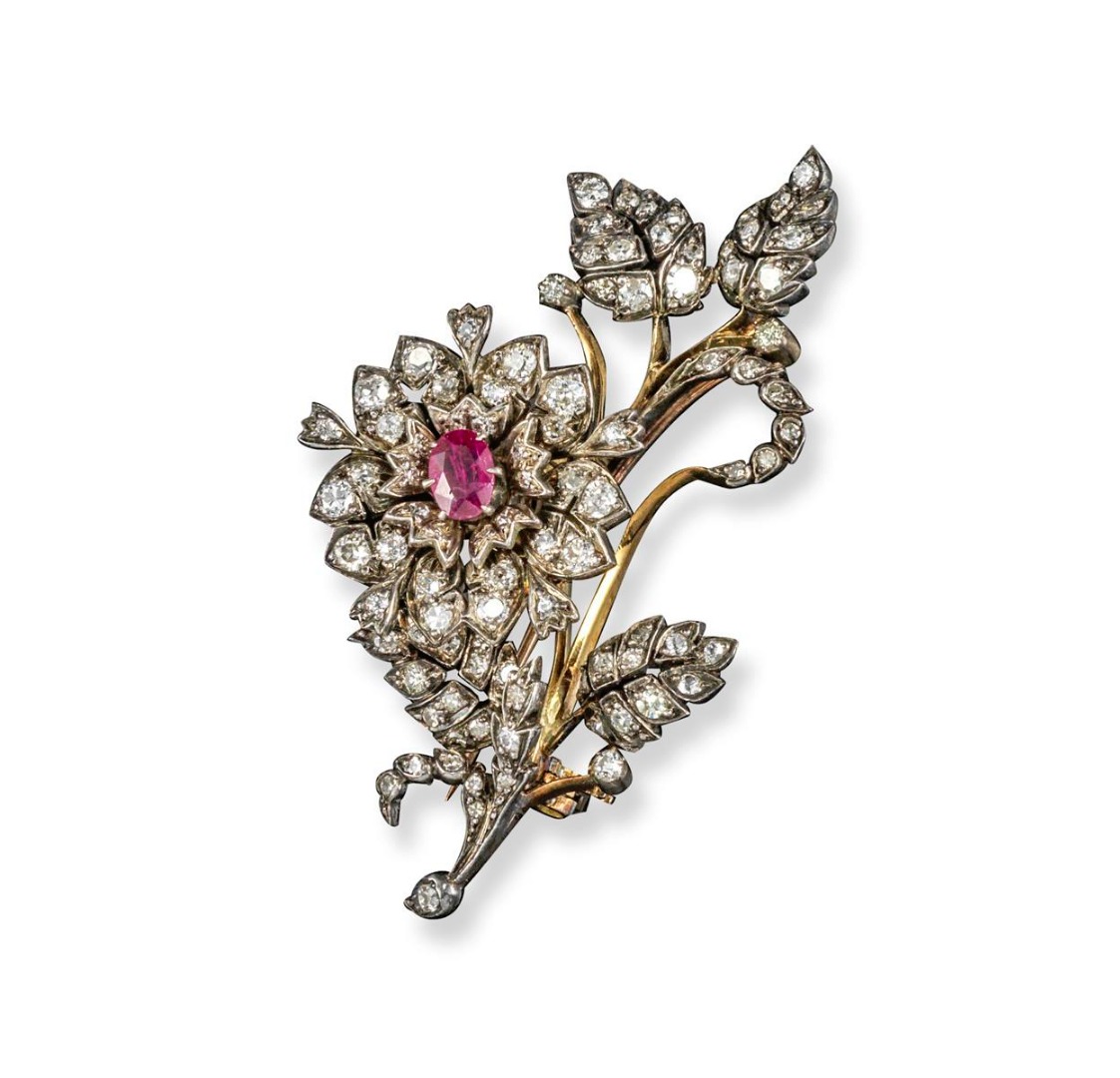A Victorian ruby and diamond foliate brooch, the principal section mounted en tremblant and set with a ruby and diamonds, on further diamond foliate spray brooch, in silver and gold.