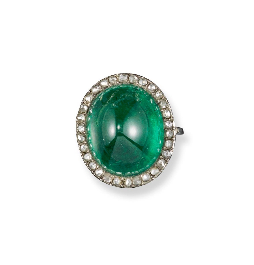 An impressive cabochon emerald and diamond cluster ring, the sugarloaf-shaped emerald weighs approximately 34.00cts and is set within a surround of rose-cut diamonds in platinum. Pierced mount. Size M.