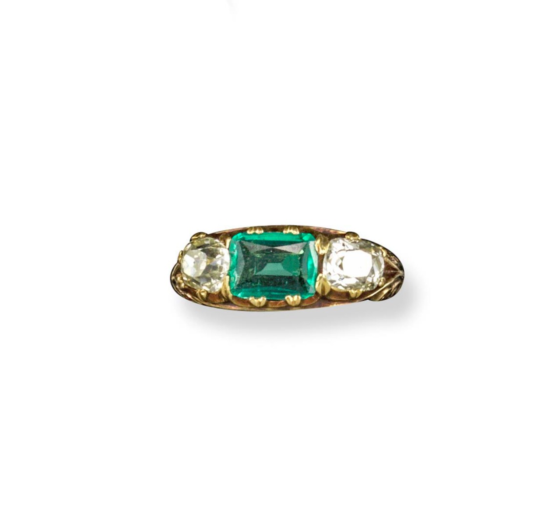 An emerald and diamond three stone ring