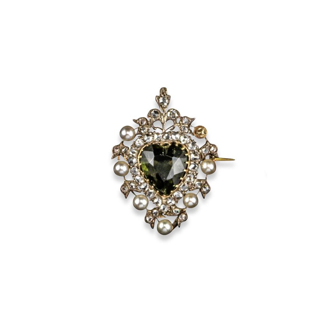 A diamond, seed pearl and paste set heart brooch, the green paste heart is set within concentric surrounds, the inner set with circular-cut diamonds, the outer with pearls (one missing) and foliate diamond clusters. With diamond-set bale, in silver and gold. 3cm long.