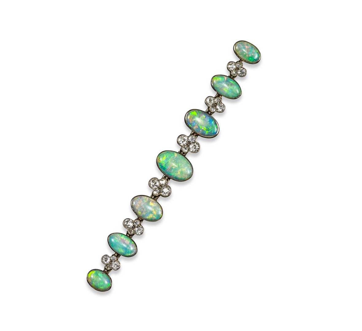 An opal and diamond brooch, alternately set with solid white opal cabochons and diamond quatrefoils in white gold. 8cm wide.