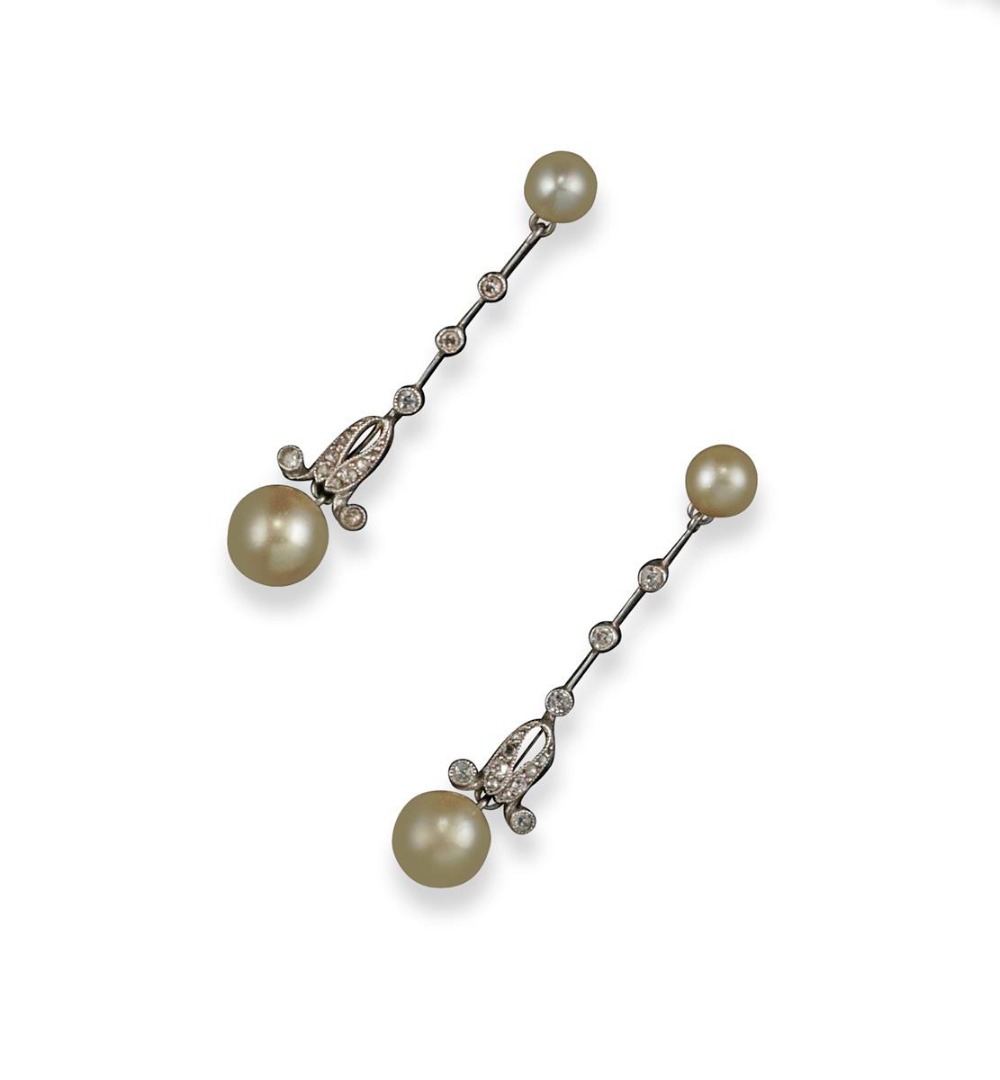 A pair of early 20th century pearl and diamond drop earrings, the pearl studs suspend a detachable and articulated knife-edge line of diamonds and a larger natural pearl. In Boucheron box.
