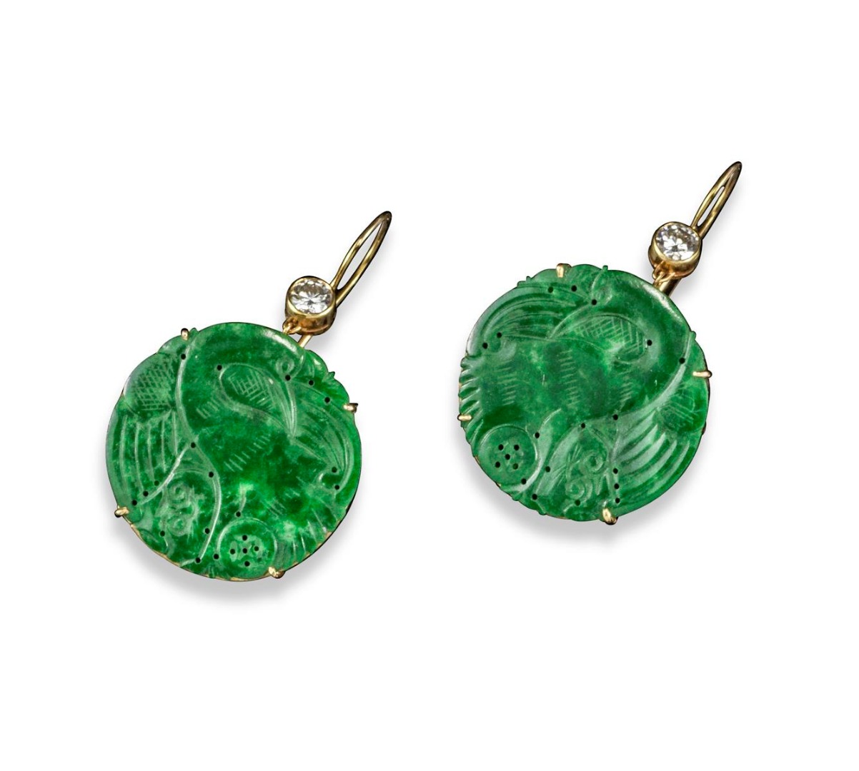 A pair of jade and diamond drop earrings, the pierced jade discs carved with cranes. Mounted in gold, each disc suspends from a round brilliant-cut diamond. 2.5cm wide.