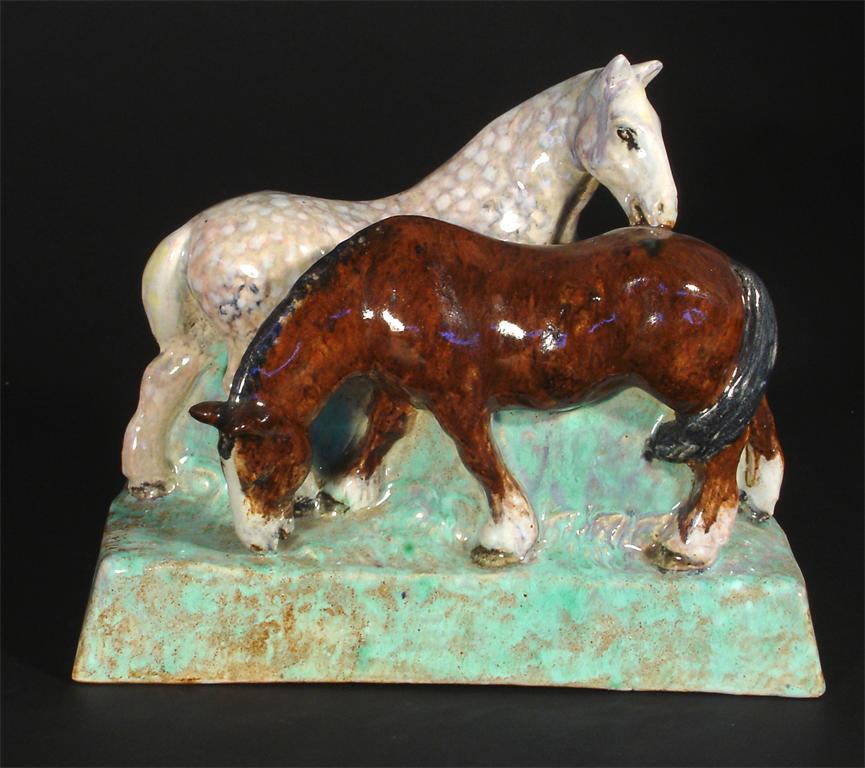A Stella Crofts stoneware horse family group modelled resting, glazed naturalistically, incised Stella R Crofts, restored ears 24cm. wide