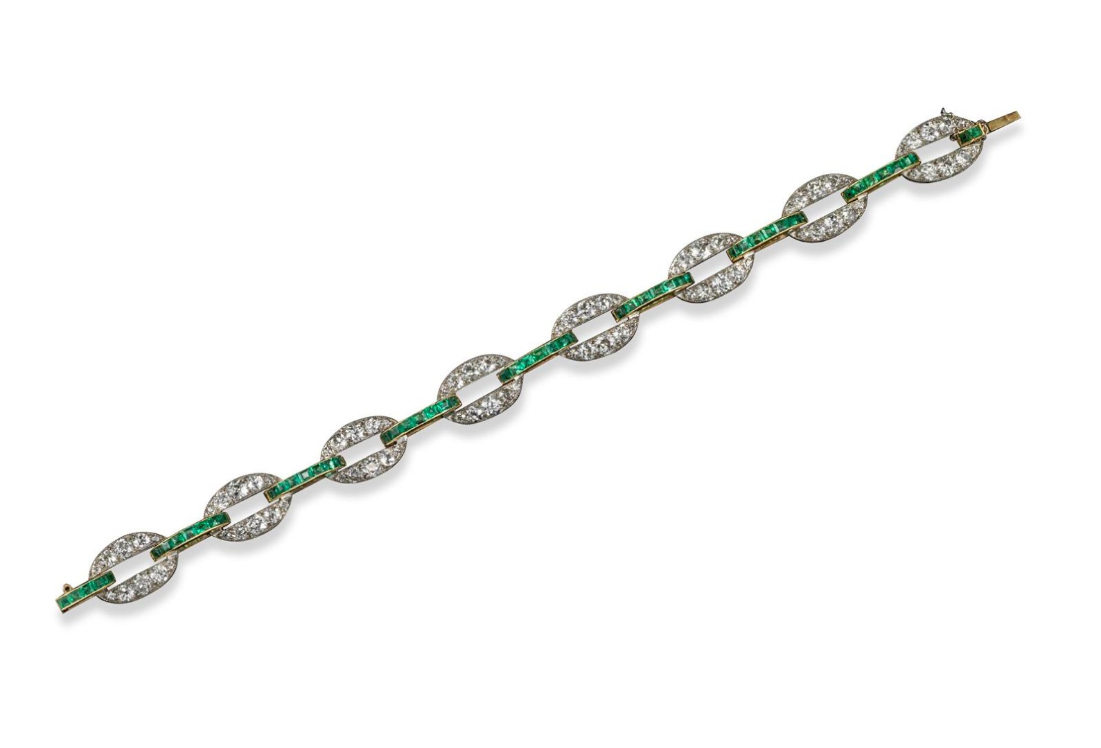 An early 20th century emerald and diamond bracelet, the pierced oval-links set with graduated old circular-cut diamonds, the raised demi-lune yellow gold links channel-set with calibre-cut emeralds. 18cm long. Fitted case by Thomas Woolley Ltd.
