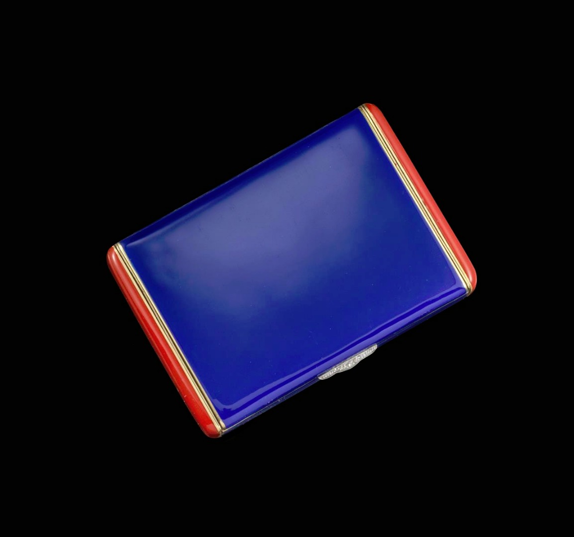 An American Art Deco gold box, of rectangular form, with blue enamel decoration and brick red enamel terminals. Diamond scroll thumb piece and engraved to the plain interior with affectionate inscription dated 1931. 8cm wide. Signed Yard. Leather case.