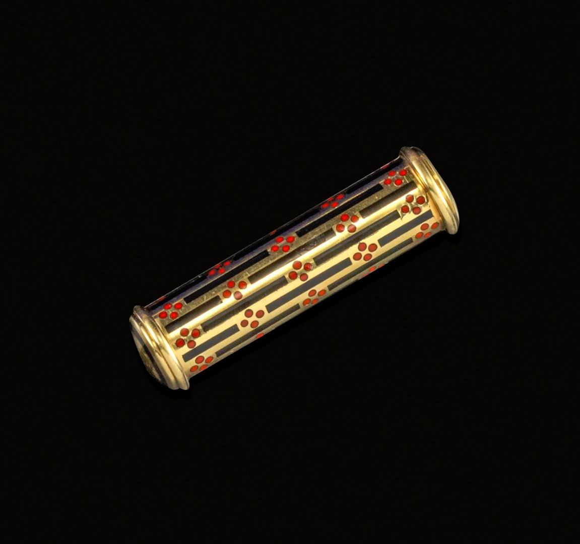A French gold Art Deco lipstick holder, of cylindrical form and decorated with black enamel strips, separated with four red pellets. French control marks and numbered 23475. 5.3cm high.