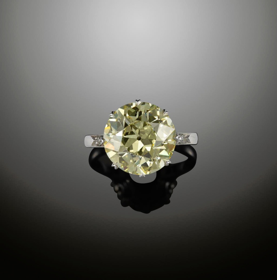 A fancy yellow diamond solitaire ring, the old circular-cut diamond weighs 5.71cts and is set in platinum coronet mount with four circular-cut diamonds to each shoulder. In platinum. Size M 1/2. With Chaumet case.