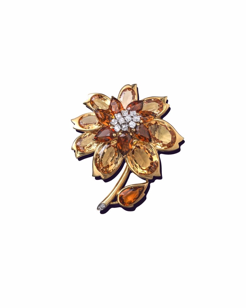 A citrine and topaz mounted gold flower brooch by Cartier, circa 1960. The stylised sunflower set with an outer border of oval-shaped topaz petals and an inner row of pear-shaped citrines, the carpels formed from circular-cut diamonds. The stem is set with a citrine leaf and a diamond to the base. Signed Cartier London and numbered 01116. 5.5cm high. With Cartier box.