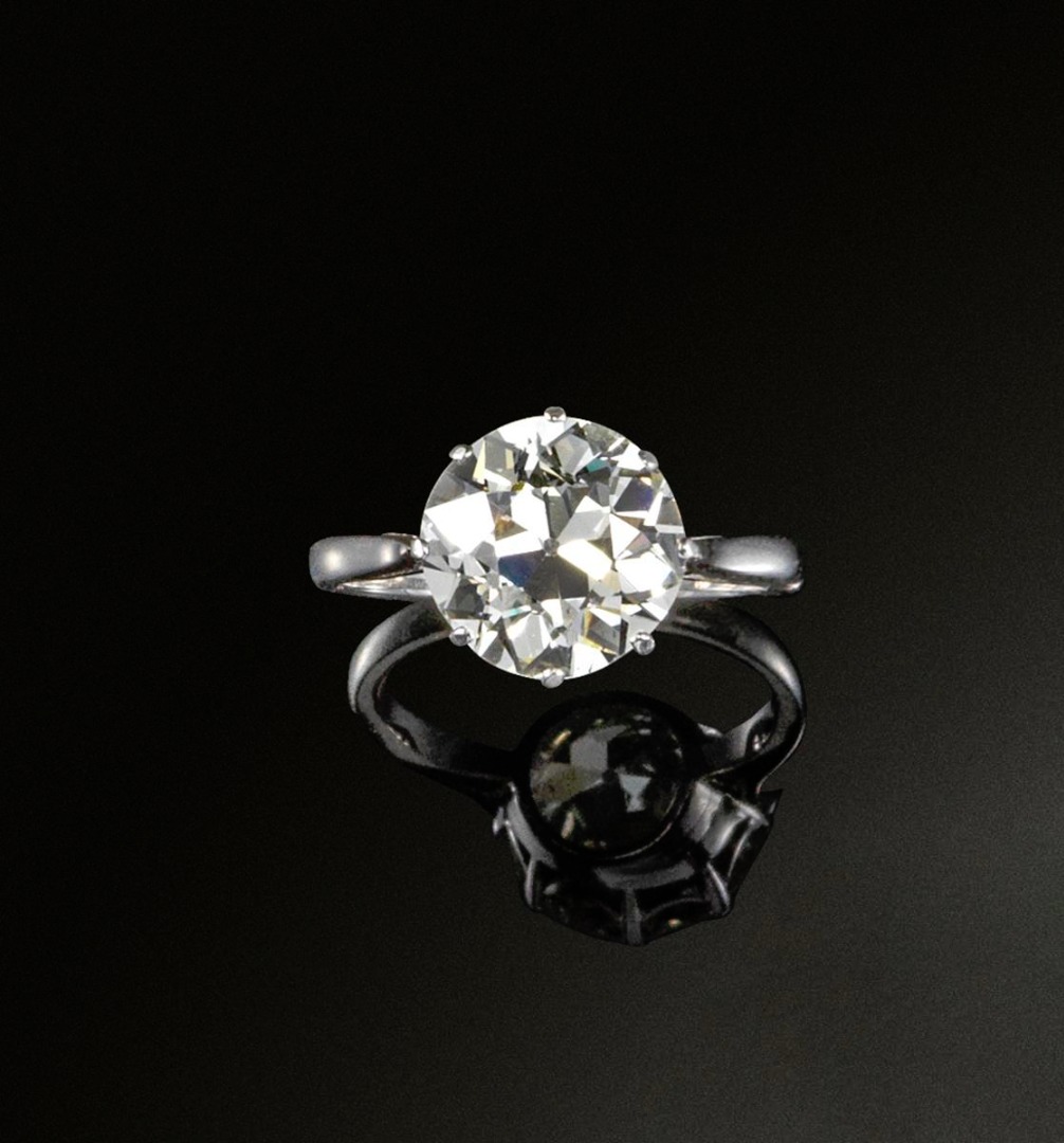 A diamond solitaire ring, the old circular-cut diamond weighs 5.17cts and is claw-set in white gold. Size N 1/2. Box.