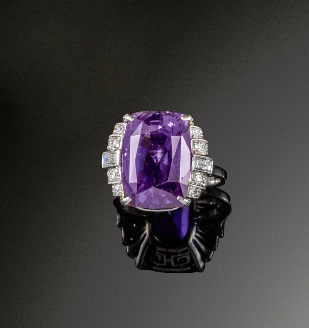 Accompanied by report number 5776-6737 dated 1st September 2016 from GCS, London stating that the cushion-cut sapphire weighs approximately 14.50cts and is a natural colour-change sapphire with no indications of heating, and is purplish blue in daylight and purple in incandescent light. Origin: Sri Lanka.