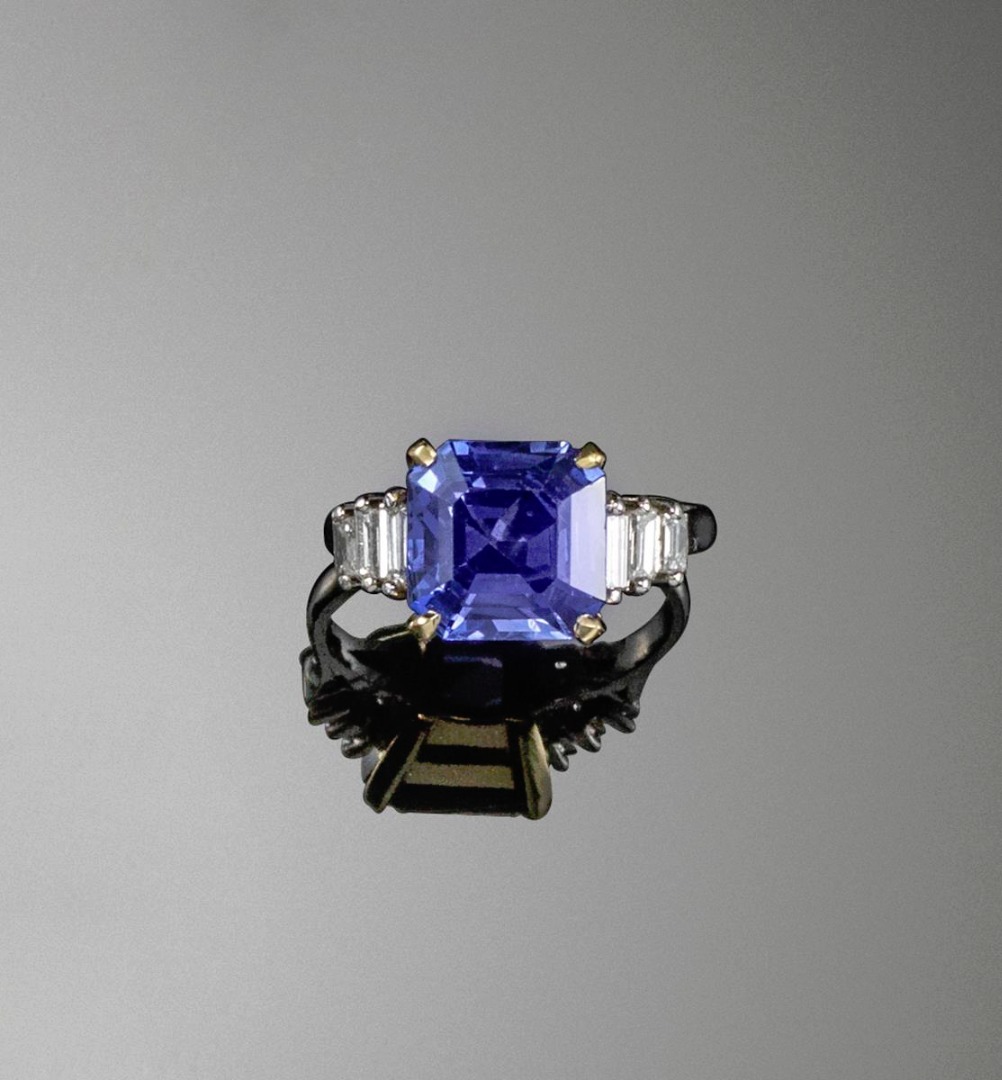Accompanied by report number 13098 dated 5th August 2016 from The Gem & Pearl Laboratory, London stating that the square-shaped emerald cut sapphire weighs 4.45cts and is a natural sapphire exhibiting a change of colour and no evidence of heat treatment. The sapphire appears blue in daylight and purple in incandescent light. Origin: Sri Lanka.
