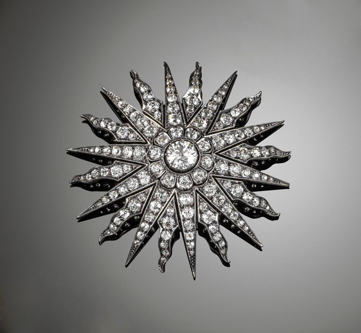 A late Victorian diamond starburst brooch, the central old circular-cut diamond weighs approximately 1.85cts within a scallop-edged surround with diamond-set rays in silver and gold. 6cm diameter.