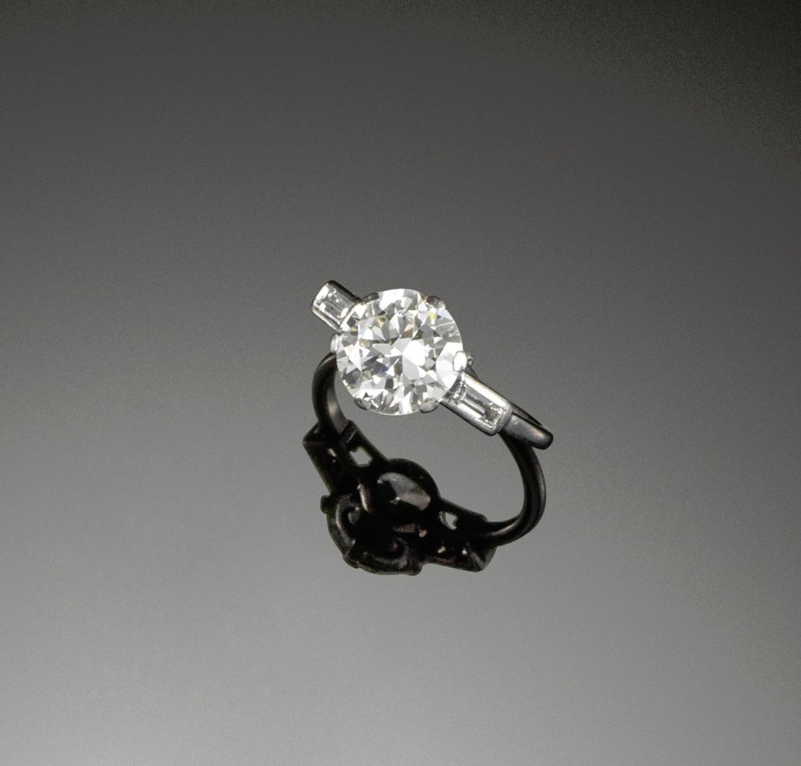 A diamond solitaire ring, the circular cut diamond weighs 2.55cts and is set with a baguette-shaped diamond to each shoulder in platinum. Size N.