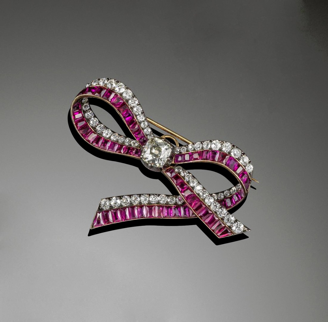 A 19th century ruby and diamond bow brooch, the ribbon set with a line of tapered baguette-shaped rubies and a line of circular-cut diamonds, the knot formed from a single old cushion-shaped diamond weighing approximately 1.30cts set in silver and gold. 6.5cm wide.