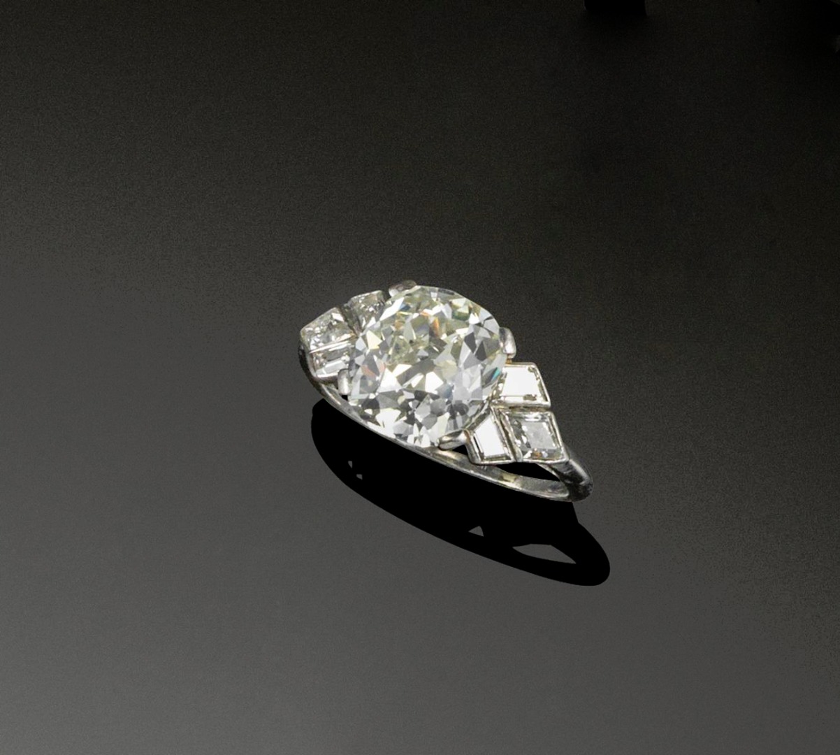A diamond solitaire ring, the old cushion-shaped diamond weighs approximately 4.00cts and is set with tapered baguette and trapeze-shaped shoulder diamonds in platinum. Size L 1/2.