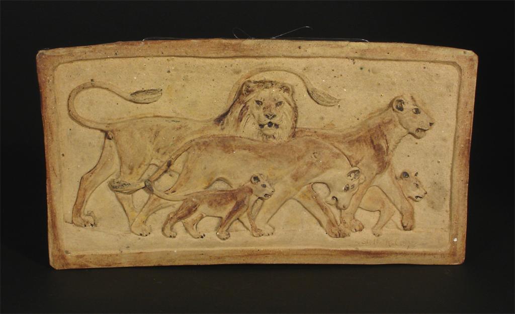 A Stella Crofts stoneware wall plaque rectangular modelled in low relief with a family of lions...