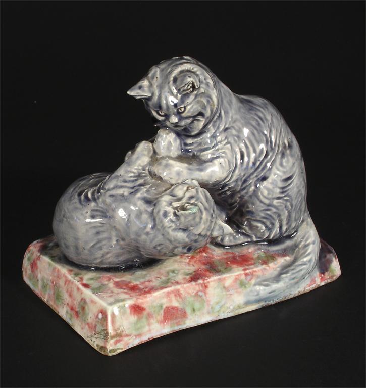 'Persian Kittens' a Stella Crofts figure group dated 1944, modelled playing, glazed in shades of blue on a mottled purple base signed Stella R Crofts, 1944 titled Persian Kittens to base 17cm. wide.