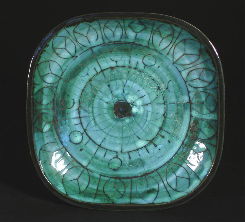 An early Troika pottery square dish painted with central flower motif, in blue and black impressed marks and trident mark, restored 18.5cm. diam.