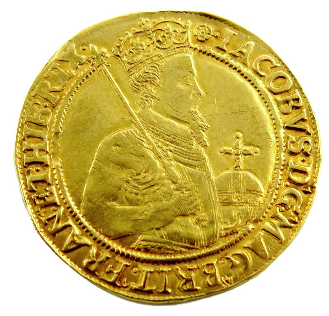 James I (1603-1625), gold Unite, Second coinage, 4th bust, mm rose, half length crowned and armoured fourth bust right holding orb and sceptre, rev crowned garnished square topped shield (S. 2619; N. 2084). Very fine.