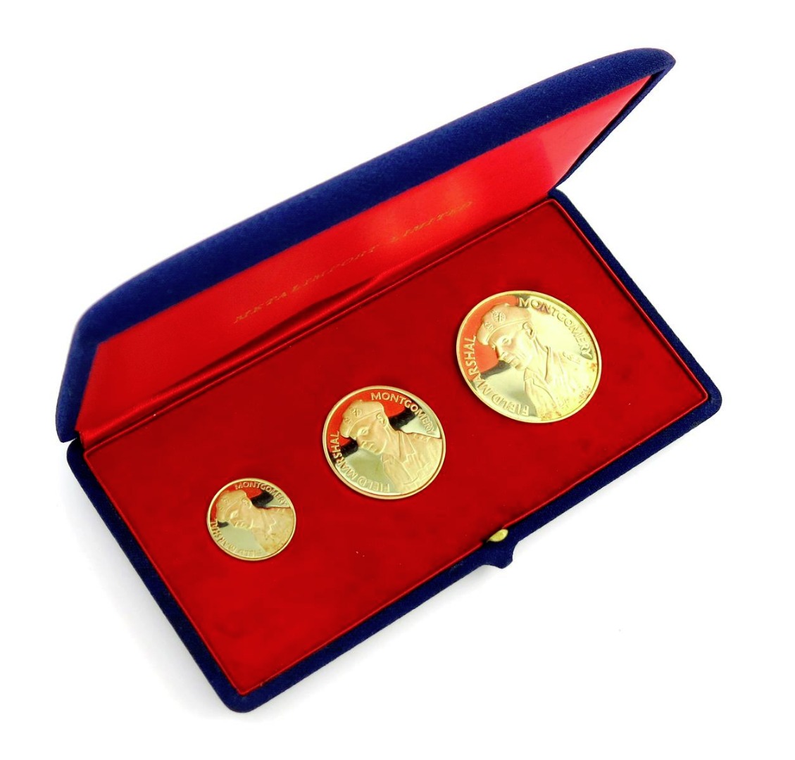 Field Marshal Bernard Montgomery (1887-1976), 25th Anniversary of Desert War, set of three gold Medals, 1965, by G. Colley for Metalimport Ltd, bust three-quarters left, rev advancing tank, 18ct, 22, 32, 40mm, total wt 61.19gms, in case of issue, with certificate, numbered 231. Virtually mint state.
