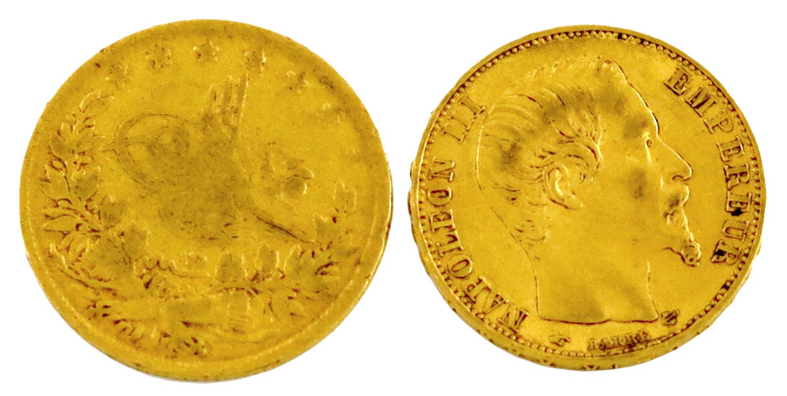 France, Napoleon III, gold 20-Francs, 1856 A; Turkey, Abdul Mejid (1839-1861), gold 100-Piastres, yr. 17. Very fine and fine.