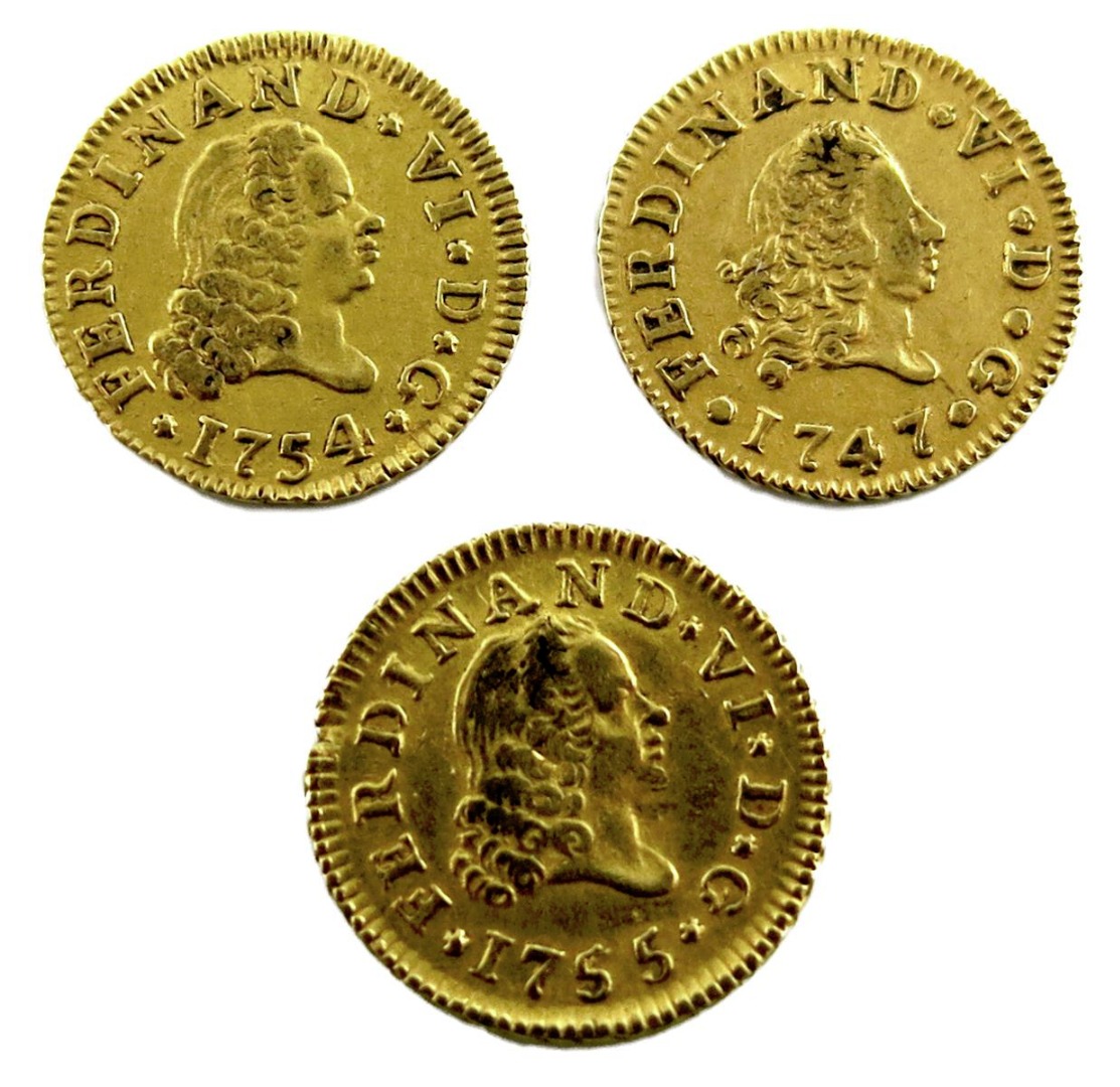 Spain, Ferdinand VI (1746-1759), gold Half-Escudos (3), 1747, 1754, 1755, all Madrid, all assayer J, bust right, rev crowned arms (F. 274; Cal ). Very fine.