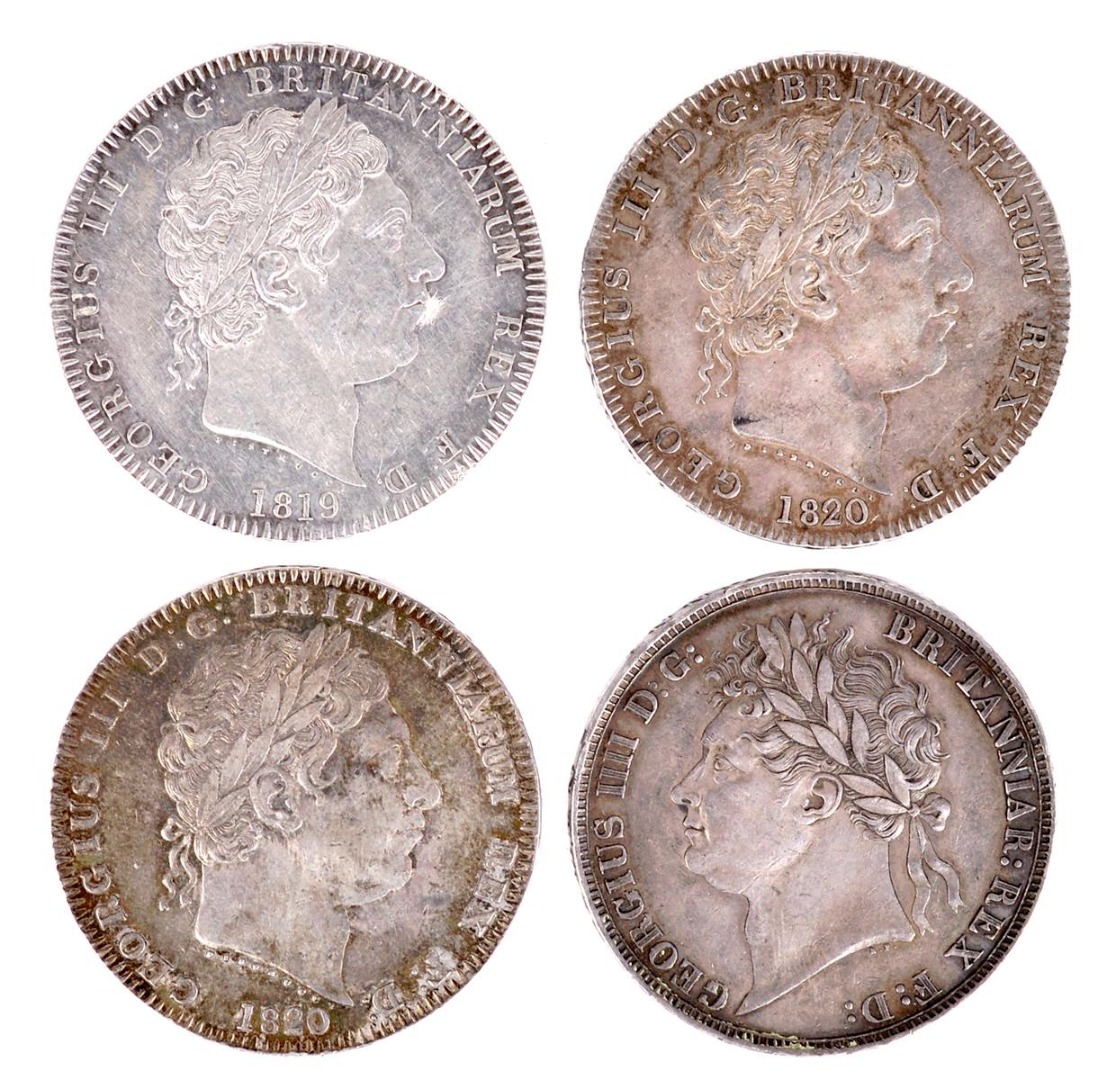 Silver Crowns (4), George III, 1819, edge LIX; 1820 (2); George IV, 1821, edge SECUNDO (S 3787; 3805). The first nearly extremely fine, the other good very fine.