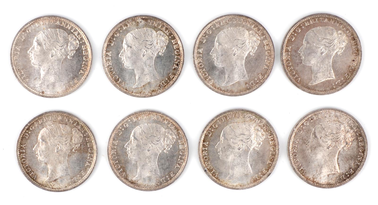 Victoria, Silver Threepences (8), 1880 (S 3914D). Extremely fine.