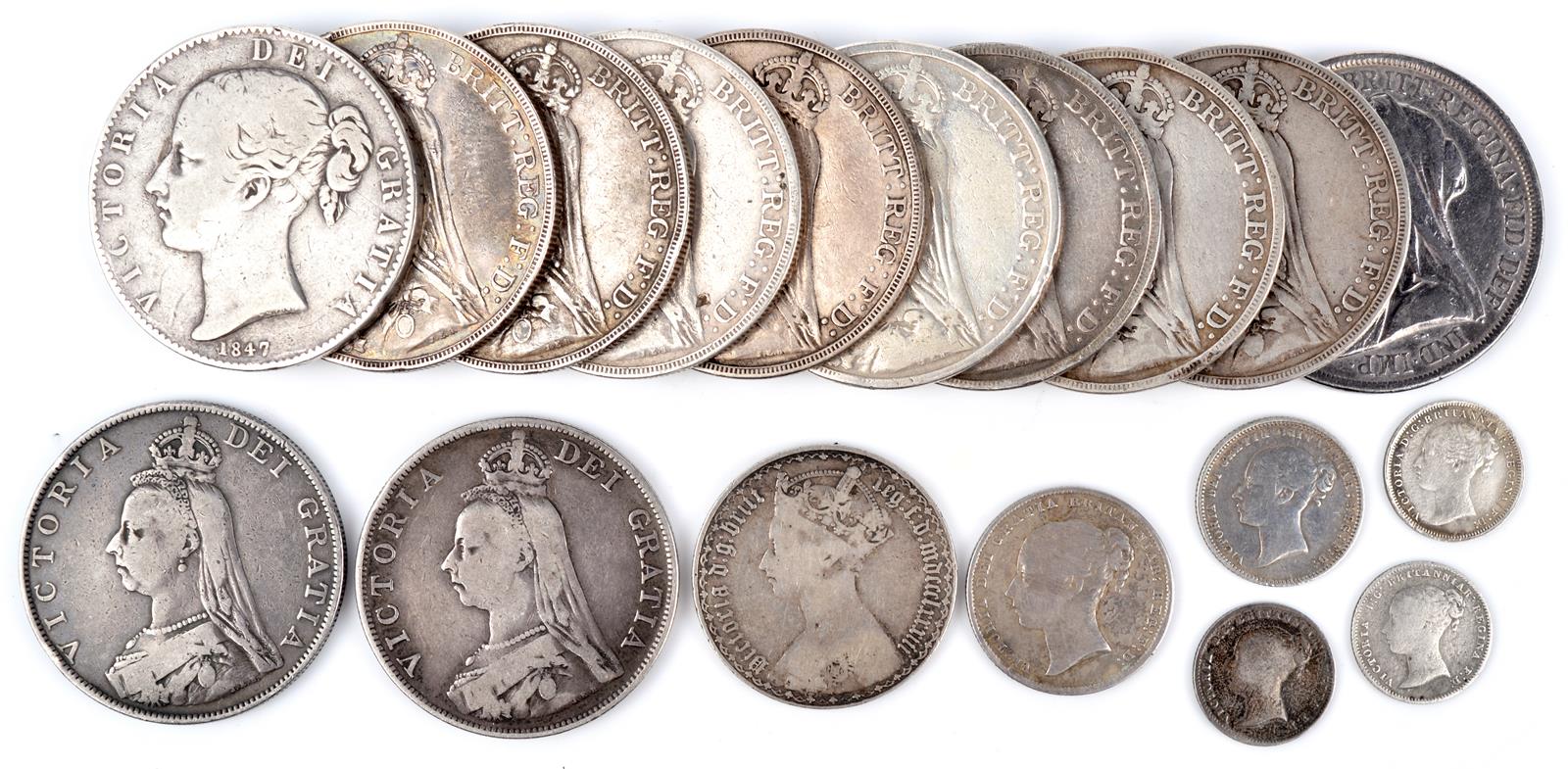 Victoria, Silver Crowns (10), 1847 (young head), 1887, 1888, 1889, 1890 (2), 1891 (2), 1892, 1893; Double-Florins (2), 1887 (Arabic 1), 1889; Florin, 1883, Gothic type; Shilling, 1866, die number 66; Sixpence, 1872, die number 17; Groats (2), 1848; Threepence, 1875 (S 3882, 3921; 3923; 3900; 3905; 3910; 3913; 3914C). Various grades, many fine or nearly so. [18]
