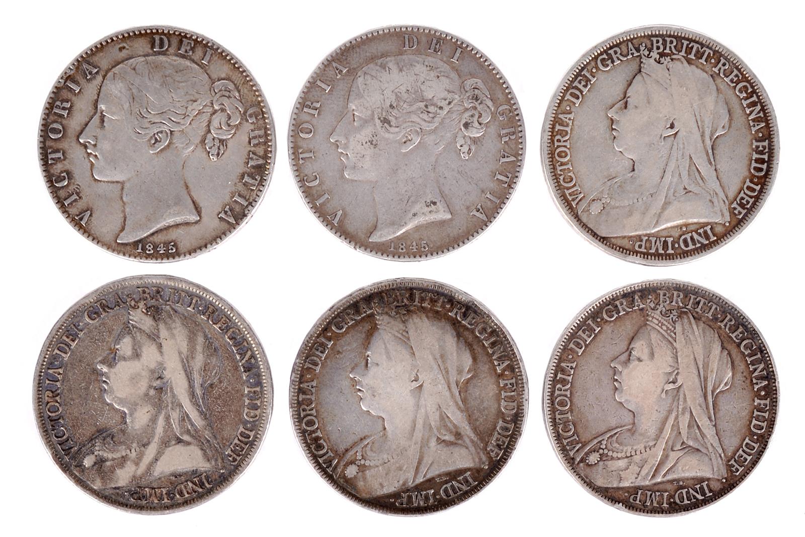 Victoria, Silver Crowns (6), 1845 (2), cinquefoil stops; 1893 (2), edge LVI; 1895, edge LIX; 1898, edge LXII; (S 3882; 3937). The first two fine or better, one 1893 and the 1895 only fair, the others near fine or better